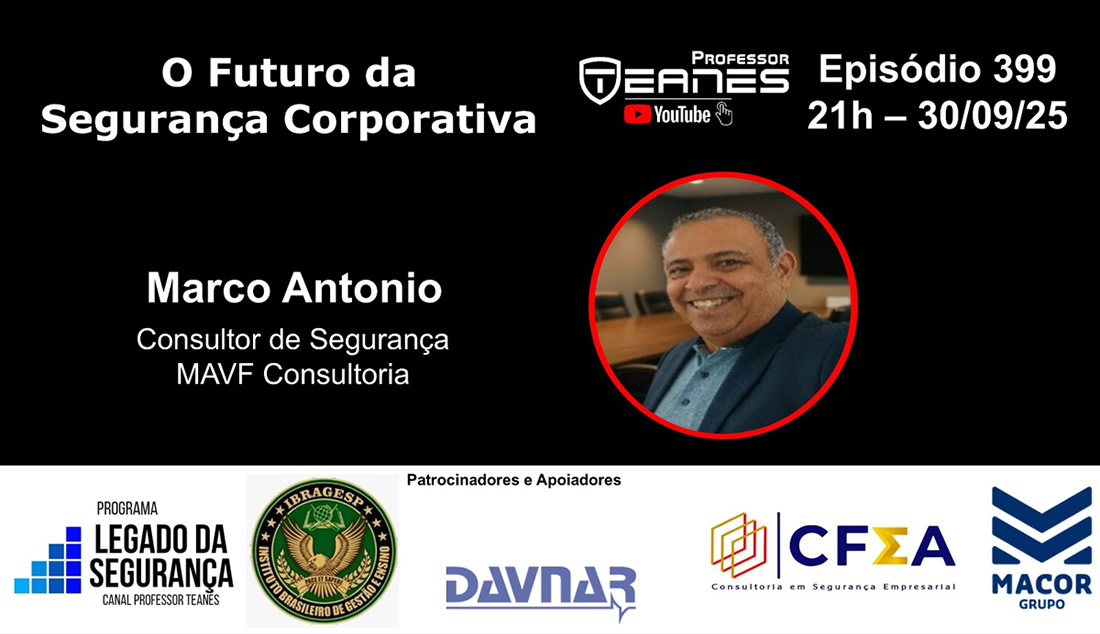 O Futuro da Segurança Corporativa, com Marco Antonio YOUTUBE: CANAL PROF. TEANES https://www.youtube.com/live/yDKa-4Z29og DATAS 30/09/2025 – 21 H Resumo Participe! 30/09 – 21h – #legadodasegurança Tema: O Futuro da Segurança Corporativa, com Marco Antonio </h3 Ative o lembrete – https://www.youtube.com/live/yDKa-4Z29og – Inscreva-se no canal e ative o sininho. Resumo: Ao